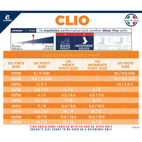 Colorful and functional, the Clio has been a staple of the Cressi fins line for many years. The blade, made with EVA, is melted during the molding with a Soft Thermo-Rubber (elastomer) used for the foot pocket, for the side stringers, and for some inserts, to offer maximum quality and comfort. The Clio features a soft elastomer foot pocket with a reinforced non-vented blade to provide maximum efficiency and comfort for snorkeling. Much care has been devoted to designing the foot pocket, designed by a computer, which ensures ease of wearing. It features a fluid and undemanding kick, perfect for children and adults alike. High comfort, much appreciated also the prolonged use of the fin and perfect for young users. The Clio is an excellent fin for snorkeling and swimming.