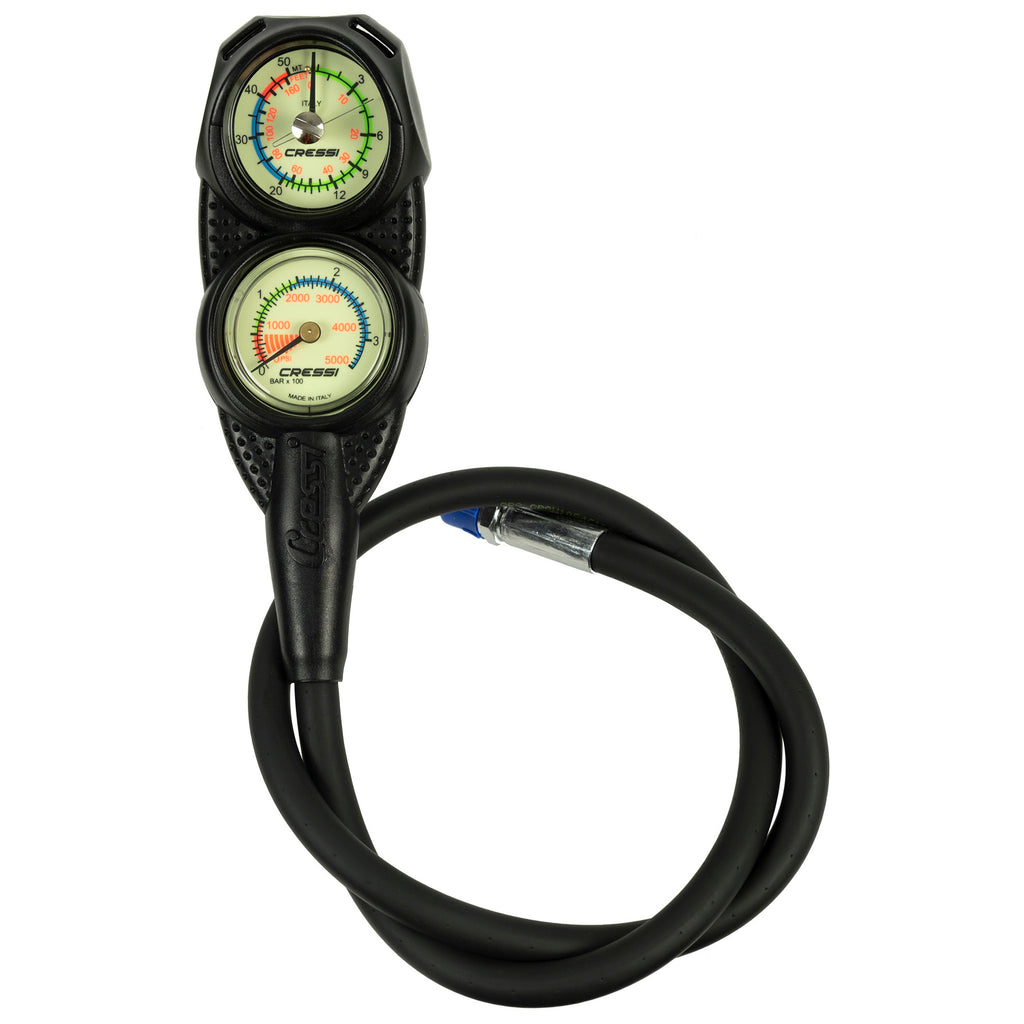 The Cressi MiniConsole 2 is a small scuba diving console that houses the Analog Pressure Gauge and the Analog Depth Gauge.