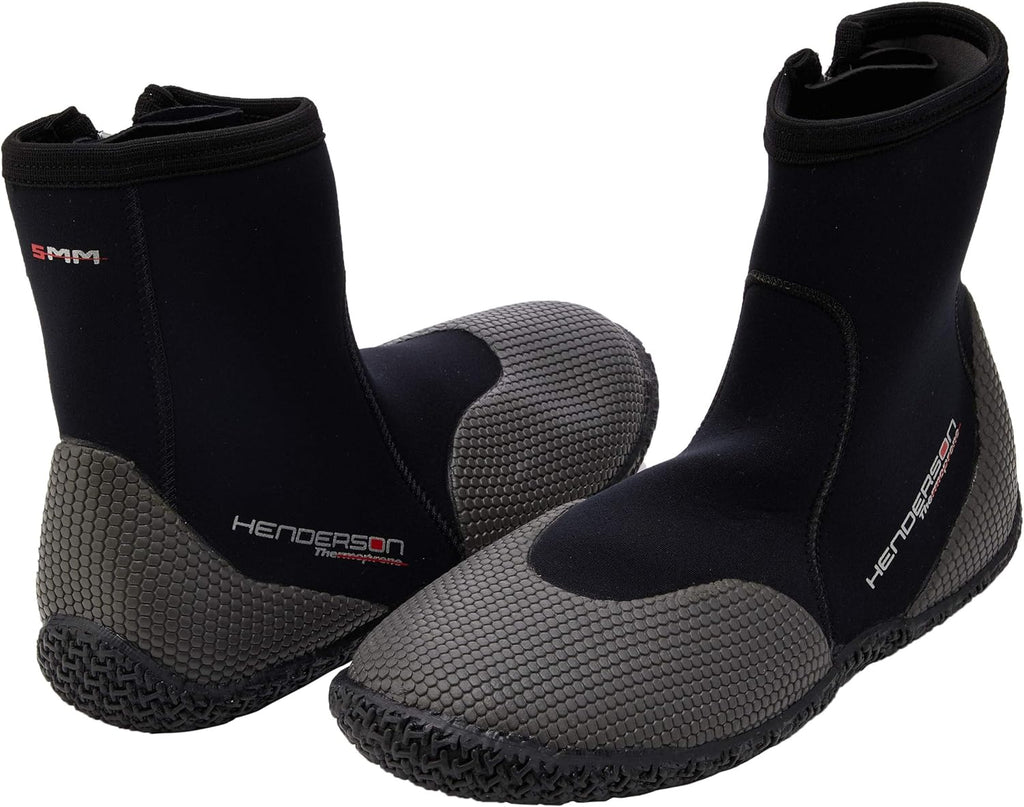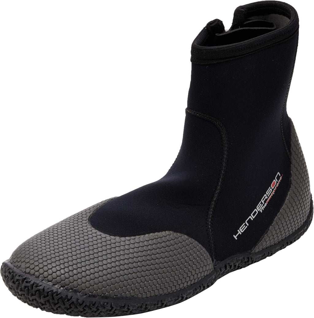Divers seeking a great value will appreciate Thermoprene's balance of performance and price. The material combination delivers greater flexibility and improved features not found in standard neoprene wetsuits, yet at a reasonable cost, perfect for the cost-conscious buyer. Thermoprene is crafted from a high-quality neoprene and a low pill fabric. It has 75% more stretch than standard neoprene, so while it is not as flexible as Henderson's Thermoprene Pro or TherMAXX lines of products, it still boasts significant comfort characteristics. The 1801/2 stretch Thermoprene is noticeably easy to don, pulling over the feet with less huff and puff than standard boots. Also, the fabric's exterior stands up extremely well to the wear of fin straps and foot pockets with its pill/abrasion-resistant exterior laminate.The Thermoprene boot line from Henderson Aquatics delivers quality and performance a step above the rest. A fantastic value. Get the features and design benefits of more expensive boots in this economically priced boot ideal for both local waters and exotic destinations. The Henderson Thermoprene High-Top Boot has a durable traction sole, glued and sewn seams, heavy duty abrasion resistant thread, and a puncture resistant sole. These 5mm nylon 2 neoprene boots come equipped with a #10 YKK heavy-duty zipper closure and Water Entry Barrier (WEB) for added comfort and warmth. A hook and loop fastener keeps the zipper in full up position while finning.