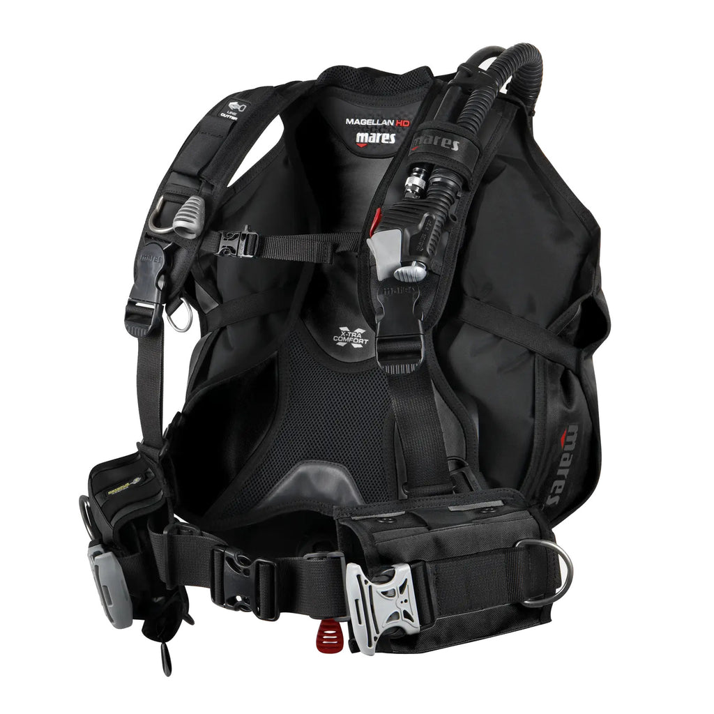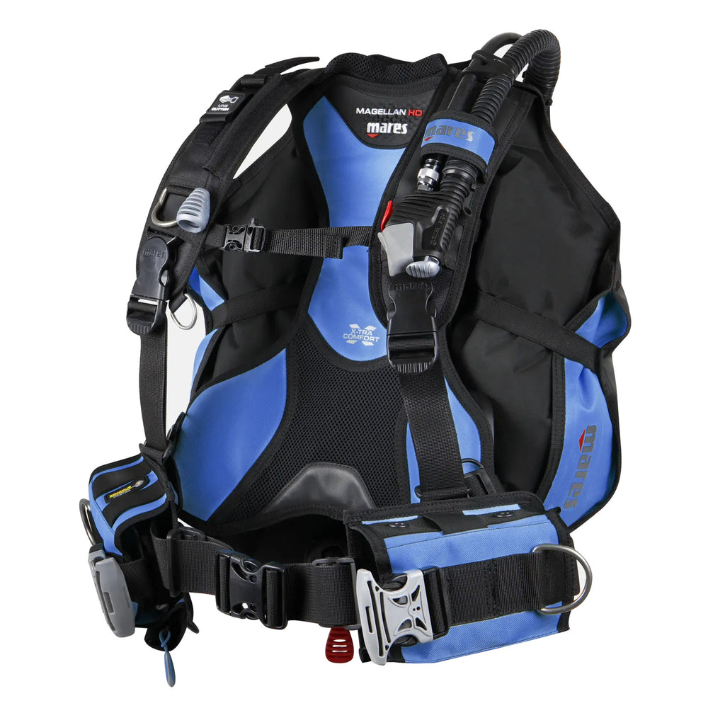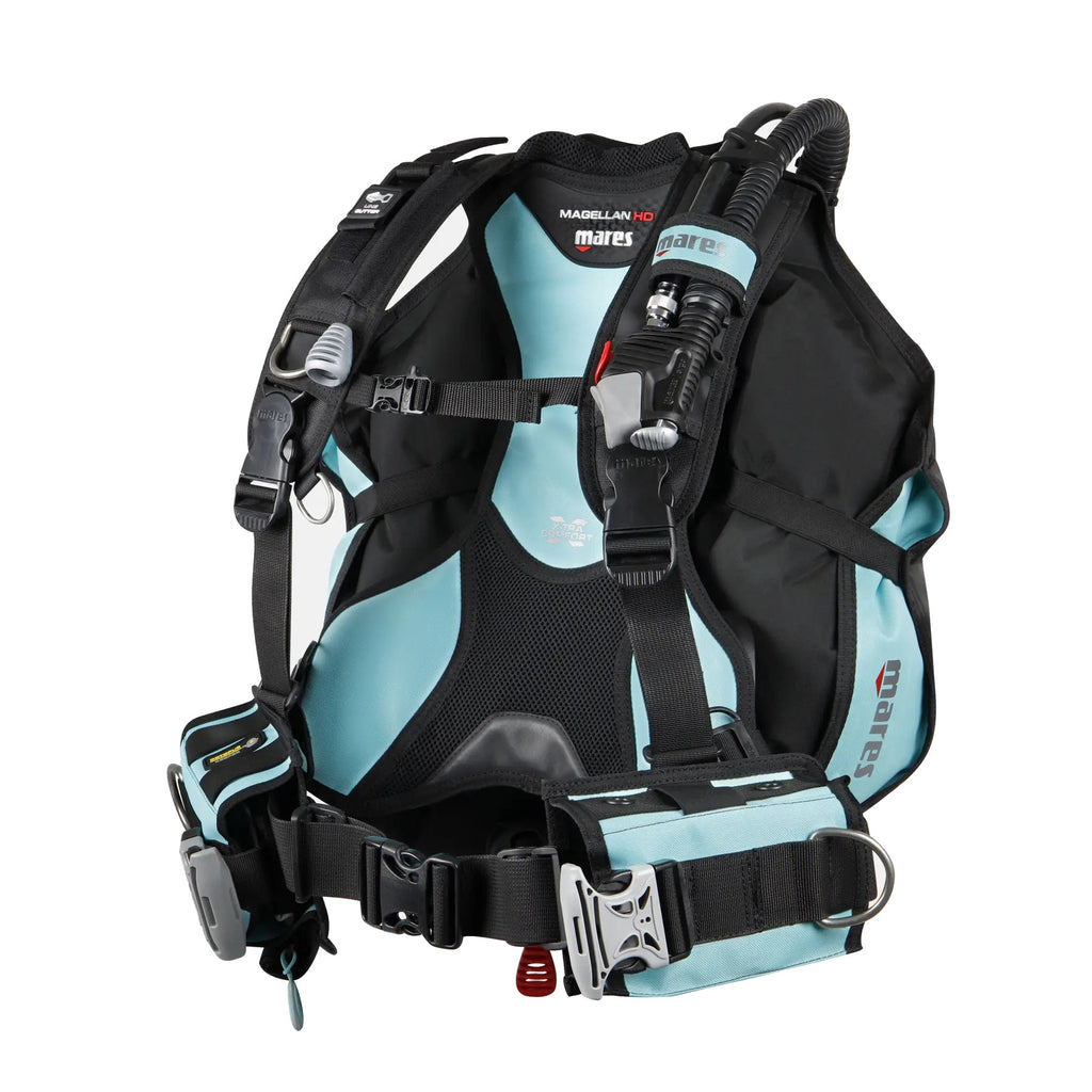 The Mares scuba BCD offers efficient back buoyancy with a 180 N lift, providing optimal support underwater. Experience enhanced comfort with X-tra cushioning on the backplate and a well-designed shoulder construction. The standard weight system, featuring two removable pockets, ensures customizable weight distribution. Practical features include knife grommets on the left pocket, elastic bands on the right for octopus security and integrated, removable Trim Weight pockets. Additional conveniences include a roll-down, zippered pocket on the right side and a dedicated sleeve for the optional Mares Titanium Line Cutter. With five stainless steel D-rings and color options in black, blue and aqua, the Mares Magellan HD scuba BCD is a reliable and versatile choice for divers.