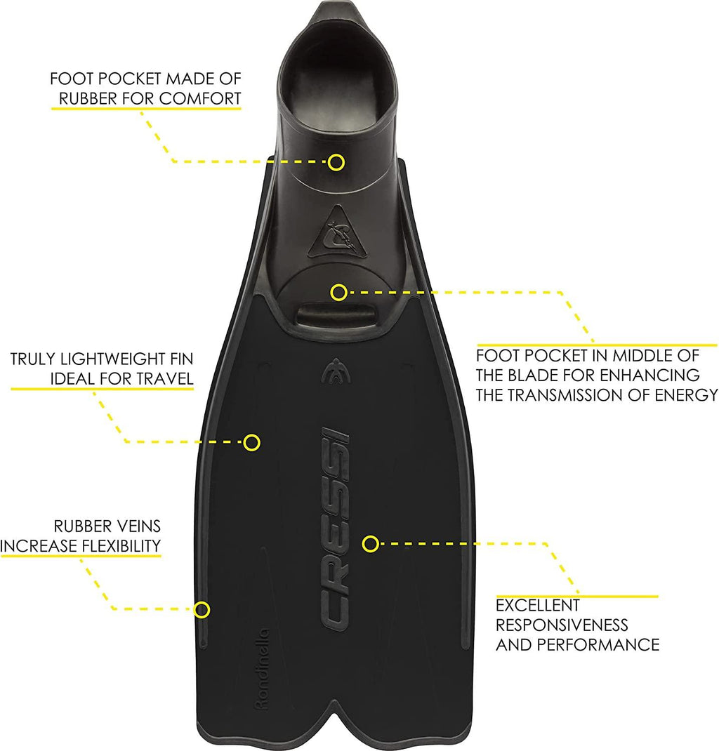 The Rondinella fin is a full foot long blade with an above blade foot pocket, made to align perfectly with your leg. They are made from light, reactive polypropylene materials. These materials make the Rondinella fins not only extremely light, but also very powerful. They are easy to use, not too demanding on the user, and perform generously. The foot pocket is an anatomical design, making it perfect for extended use.