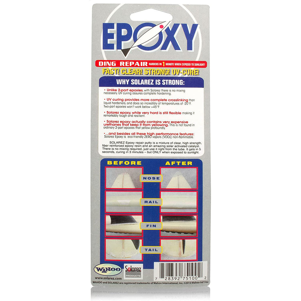 SOLAREZ Epoxy repair putty is a mixture of clear, high strength, fiber reinforced epoxy resin and an amazing solar activated catalyst. There is no mixing required. Just use it right from the tube. It gels in 5 seconds, curing in 3 minutes – but ONLY when exposed to sunlight.