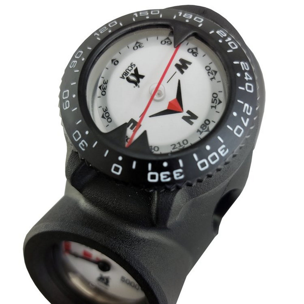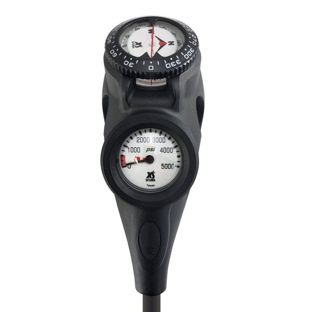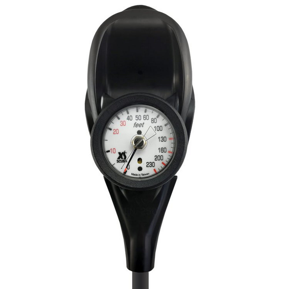 The XS Scuba Orca series of analog gauges represents the best value. They are an excellent choice for rental, class use or to round out package deals. The gauges are CE certified and meet the accuracy of the EN250 and EN13319 norms. The front side of the console has a pressure gauge and a compass. The reverse side has a depth gauge. All gauge and compass faces are luminescent for low light conditions. The three instruments are housed in a durable, impact resistant rubber boot that is attachment clip ready. The highly accurate bourdon tube design pressure gauge provides a 0 to 5,000 psi readout with a bright red color-coded pressure reading from 0 to approximately 800 psi for reserve air indication. There is a built-in safety plug on the back of the pressure gauge and it comes with a 7/16" threaded 32" (81cm) high-pressure rubber hose. The consoles air-filled steel membrane mechanism depth gauge provides depth readings from 0' to 230'. The depth readings from 0' to 60' are in 10' numerical increments and from 60' to 100' are in 20' numerical increments and from 100' to 230' they are in 30' or 40' numerical increments. Depth readings from 10' to 30' are in red color for easy reading when making decompression/safety stops. Red indicator marks starting at 130' to full scale are in red to indicate depths beyond normal sport diving limits. The depth gauge is also equipped with a maximum depth indicator needle. The maximum depth indicator needle (MDIN) is pus